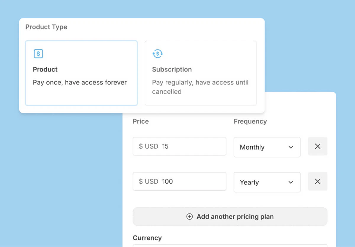 You can set up your product for one-time purchases, recurring subscriptions, or give your audience the option to pay what they want. You can also offer multiple subscription tiers or add discount incentives to help drive more sales.