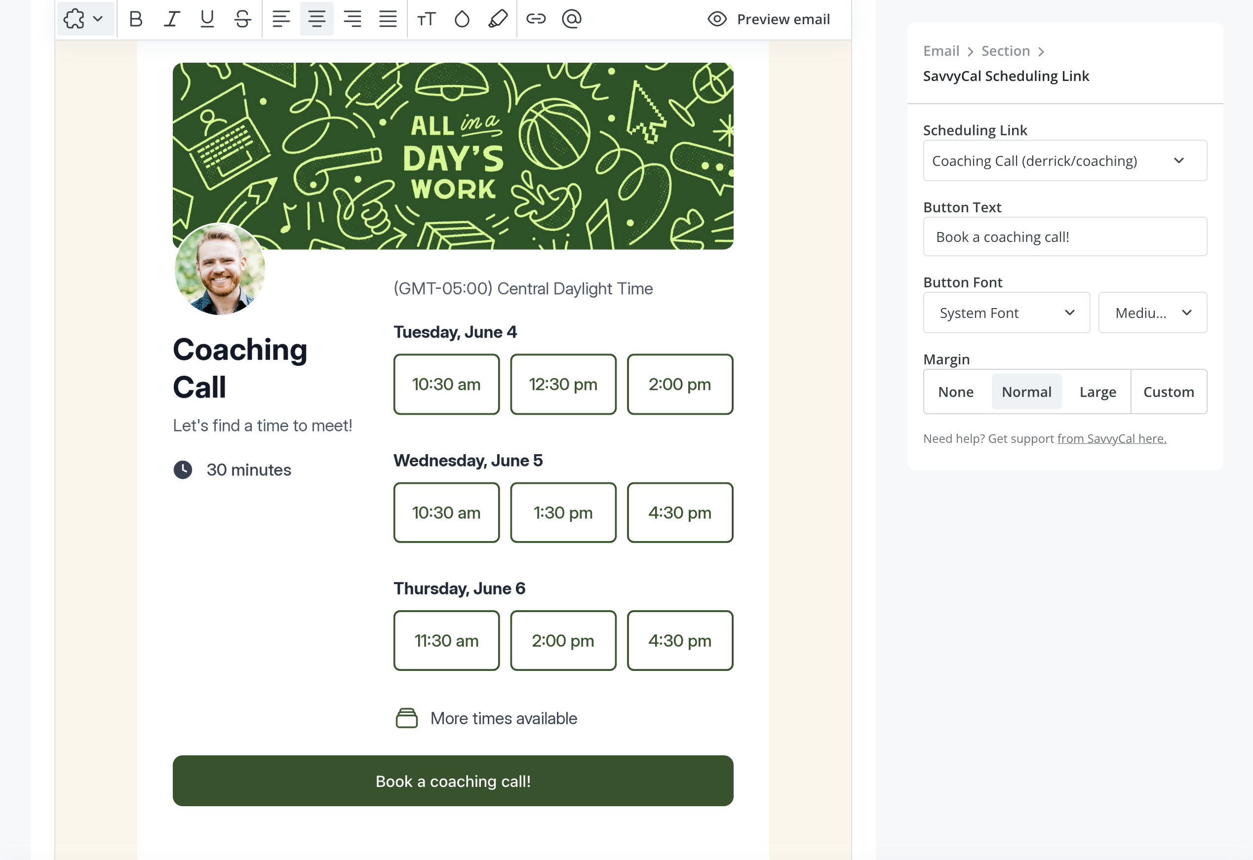 The SavvyCal app for Kit allows you to embed visual previews of your SavvyCal scheduling links directly in your Kit emails. ( Example)
